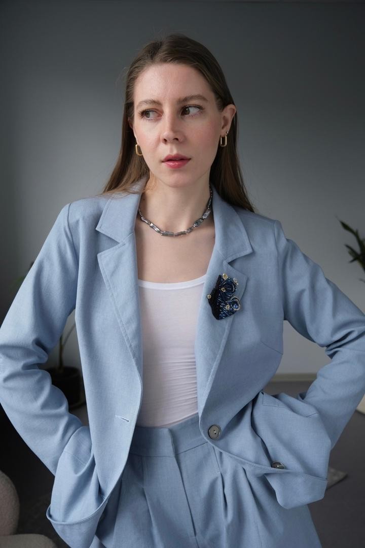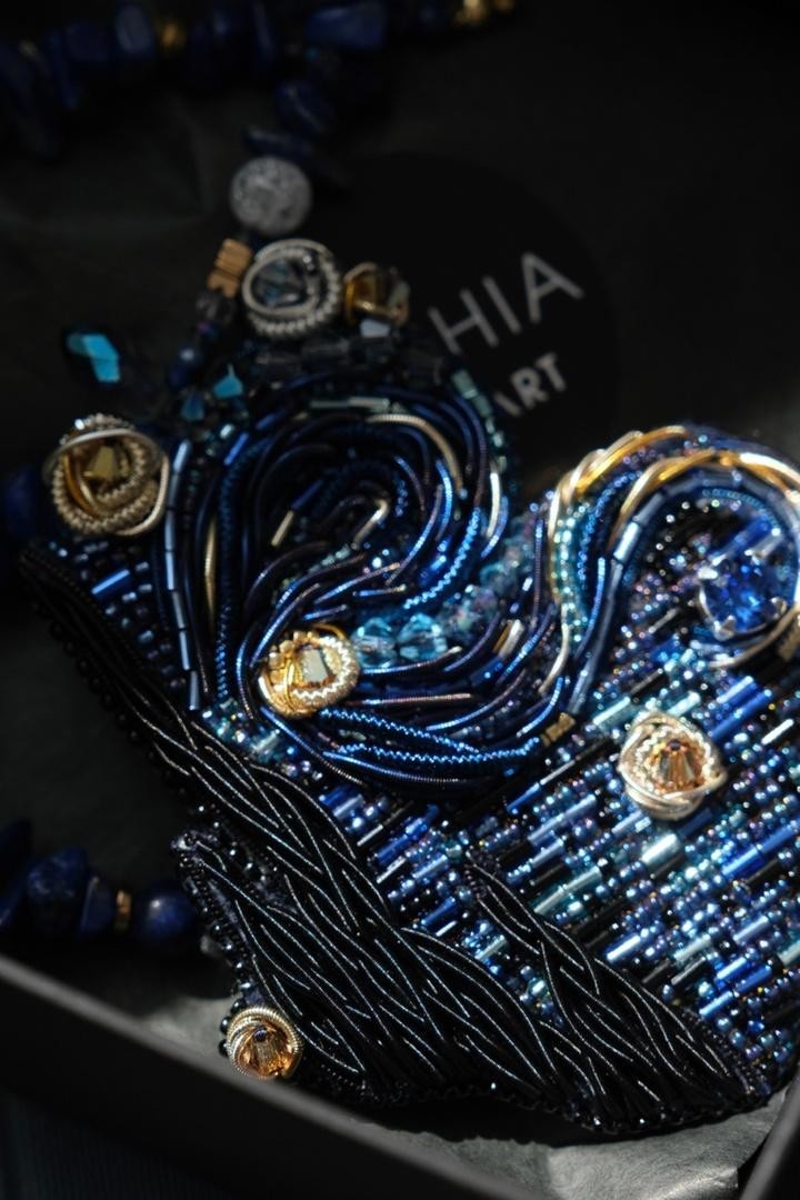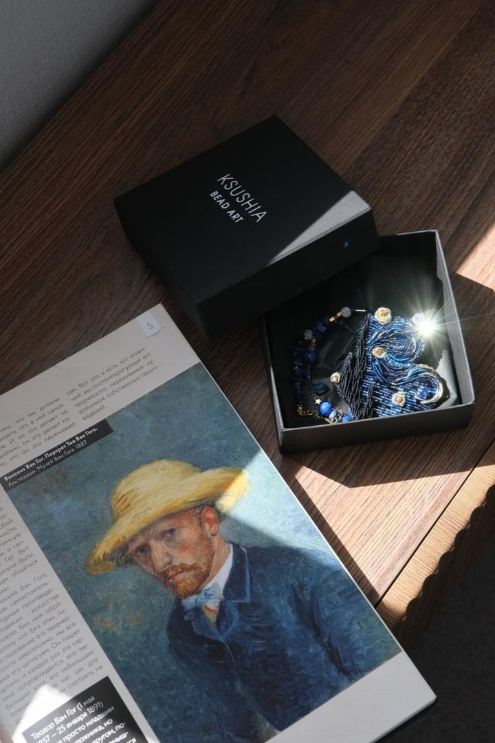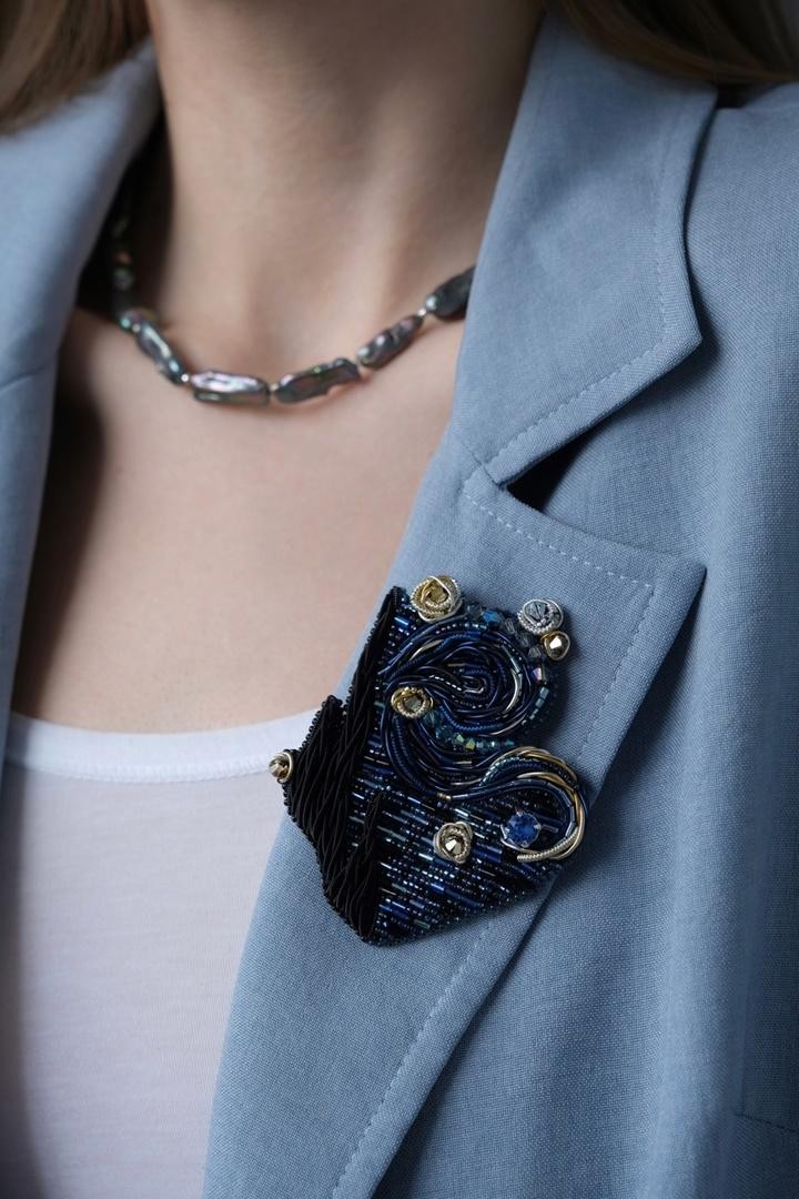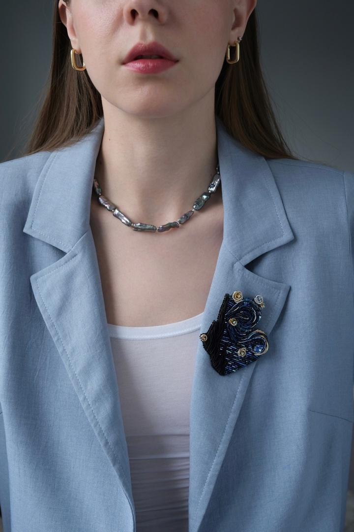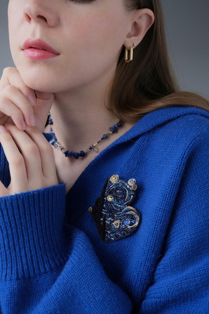 Брошь, вдохновлённая известной картиной Винсента Ван Гога, повторяющая его знаменитые мазки вышивкой из канители и японского ювелирного бисера