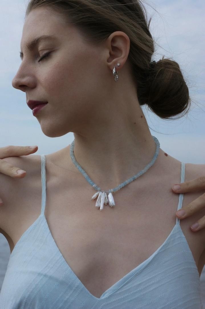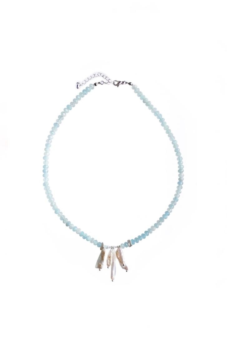 Колье собрано из натурального гранёного аквамарина с центральным элементом из жемчуга, который напоминает острые ледяные сосульки. Длина 39-44см<br /><br />При необходимости скорректировать длину, пожалуйста, напишите об этом в комментарии к заказу! Мы соберём чокер необходимого для вас размера бесплатно (бесплатное увеличение длины до 5см)